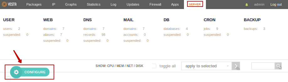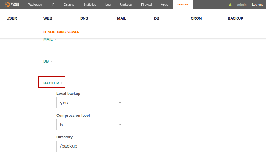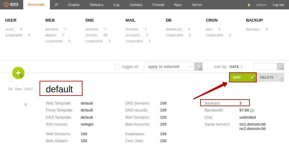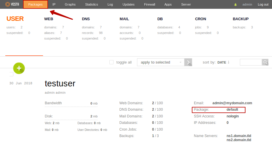 По умолчанию бекап отрабатывает от по заданию в планировщике3). Чтобы изменить количество хранимых бекапов, нужно отредактировать наш package который выбран для пользователя4). В меню USER в информации про нашего пользователя видно количество бекапов и какой Package используется. Чтобы изменить количество бекапов перейдем в верхнем меню в раздел Packages