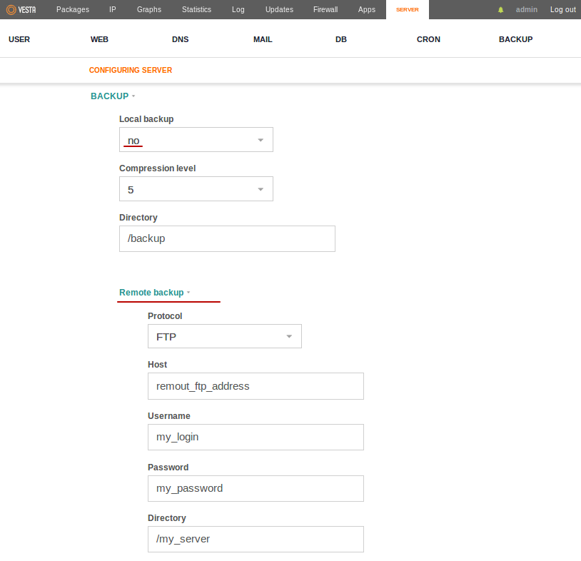 Если поле Local backup оставить значение YES то бекап будет храниться и локально и на удаленном сервере. Если значение Local backup установлено в No то локально бекап храниться не будет, но в панели управления будет отображаться и будет доступен для восстановления из удаленного FTP.