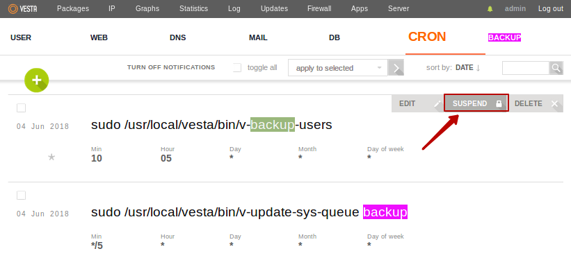 Переходим в меню CRON и напротив нужного нам задания нажимаем suspend
