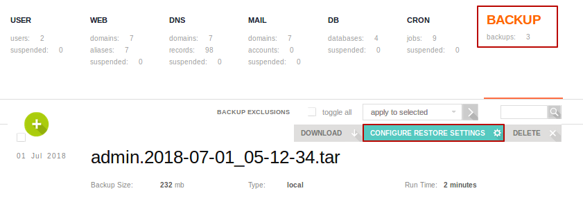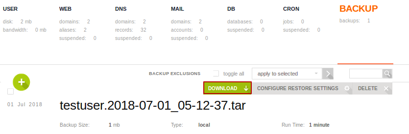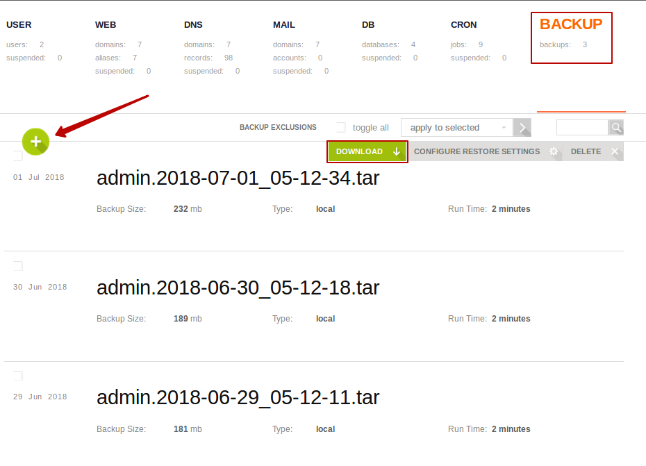 Для создания бекапа достаточно перейти в пункт меню BACKUP и нажать на Create Backup2). После чего задание на создание бекапа будет добавлено в очередь и со временем бекап начнет выполняться в фоне. Когда все будет готово, новая резервная копия появиться в этом же пункте меню и будет доступна для скачивания