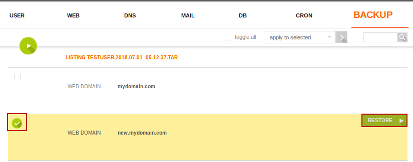 v-restore-user testuser /home/backup/testuser.2018-06-30_05-12-20.tar new.mydomain.com new.mydomain.com new.mydomain.com testuser_mydatabase