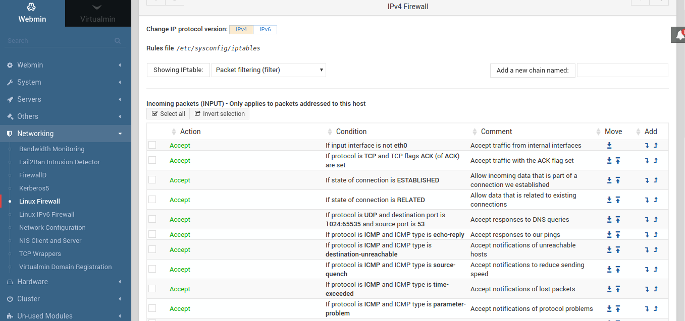 Для управления файрволом в Webmin+Virtualmin установлен специальный модуль Linux IPTables Firewall