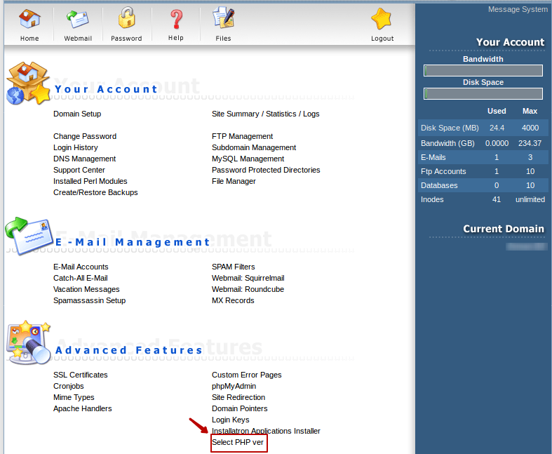 Для того чтобы сменить версию PHP для домена, заходим в управление доменом и выбираем Select PHP ver.
