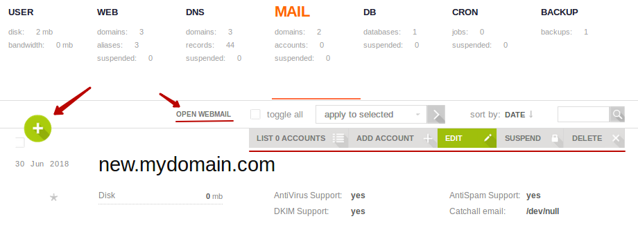 Если при создании домена была поставлена галочка напротив Mail Support то был создан одноименный почтовый домен. Если это небыло сделано, не беда, его можно создать в любой момент. Управление почтой происходит из меню управления MAIL. Чтобы добавить новый почтовый домен нажмите на плюсик и укажите имя домена.