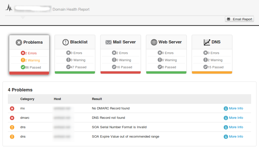 Хороший сервис для проверки работоспособности почтового домена mxtoolbox.com. Переходим на этот сайт и в поле Domain Name вбиваем наш почтовый домен и жмем на кнопочку MX Lookup. Откроется новое окно в котором нужно нажать на зеленую кнопочку Find problems и получаем результат подобный этому