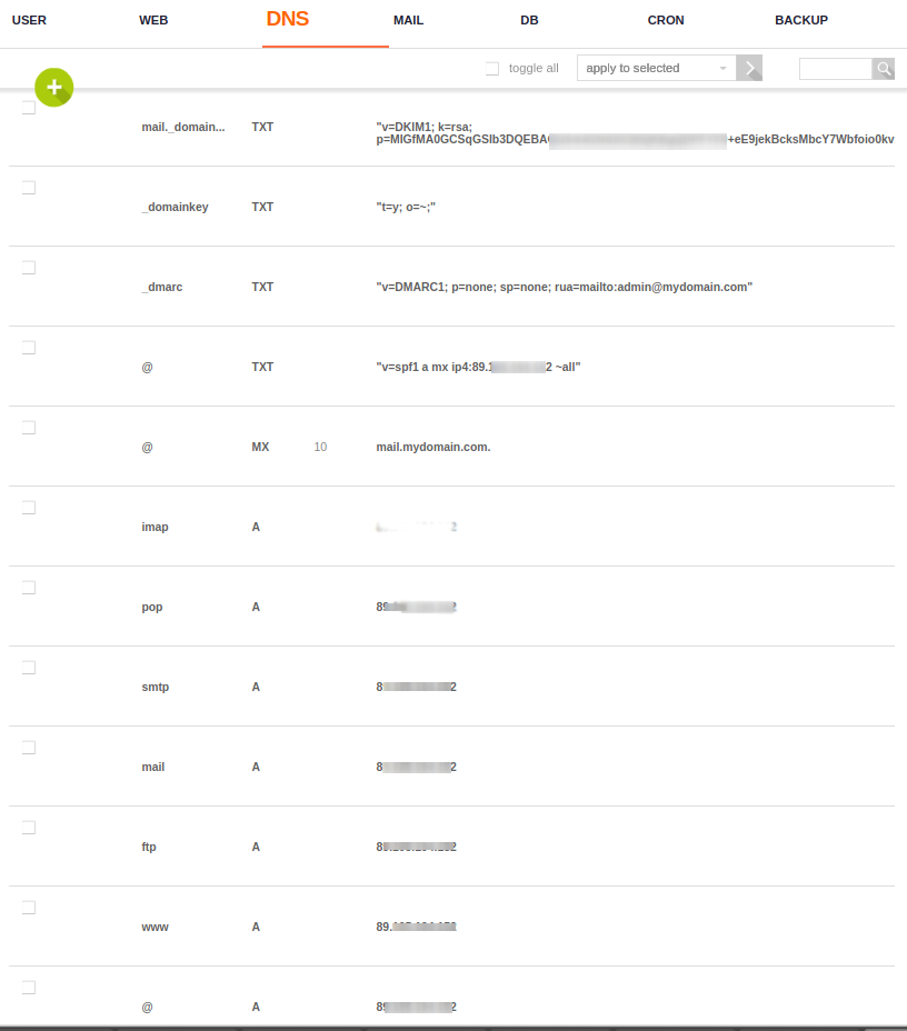 • dmarc, пример TXT-записи: _dmarc TXT «v=DMARC1; p=none; sp=none; rua=mailto:admin@mydomain.com»