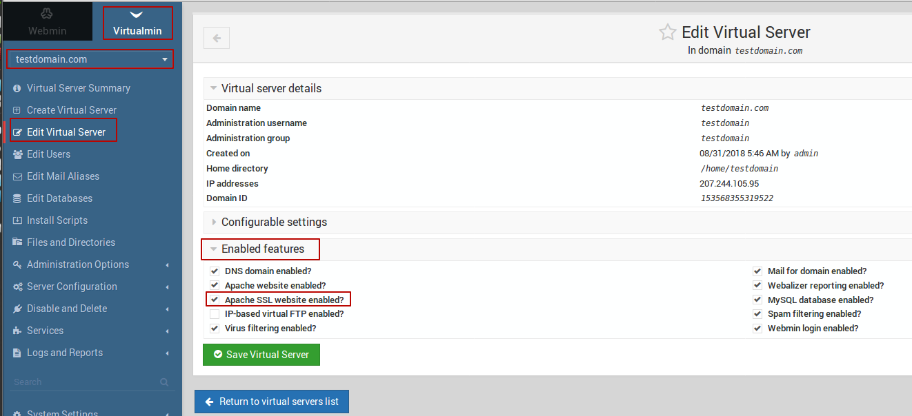 Логинимся в панель управления и переходим в управление доменом testdomain.com. Сначала убедимся что у нас включена поддержка SSL в веб-сервере apache для нашего домена. Для этого переходим в Edit Virtual Server –> Enabled features и убеждаемся что у нас стоит галочка напротив пункта Apache SSL website enabled?. Если это не так ставим галочку и нажимаем Save Virtual Server: