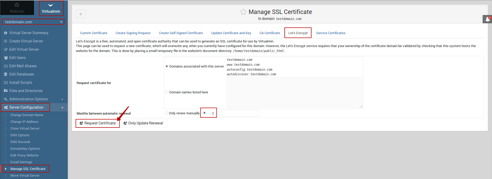 Рассмотрим пример получения сертификата для домена testdomain.com.
